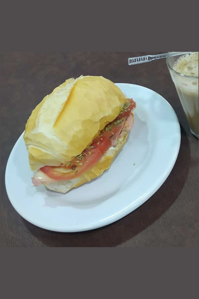 Pão francês, maionese caseira, presunto, queijo, tomate e orégano.