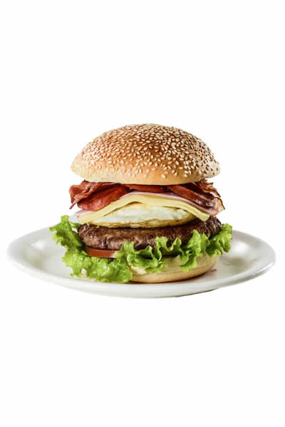 Pão de hamburguer, maionese caseira, hamburguer, queijo, presunto, alface e tomate.