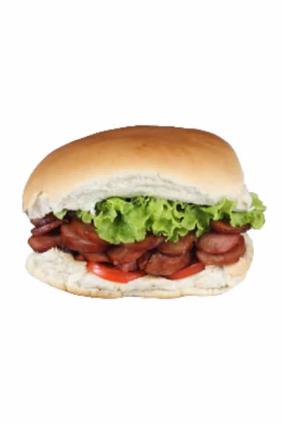 Pão de hamburguer, maionese caseira, hamburguer, presunto e queijo mussarela.